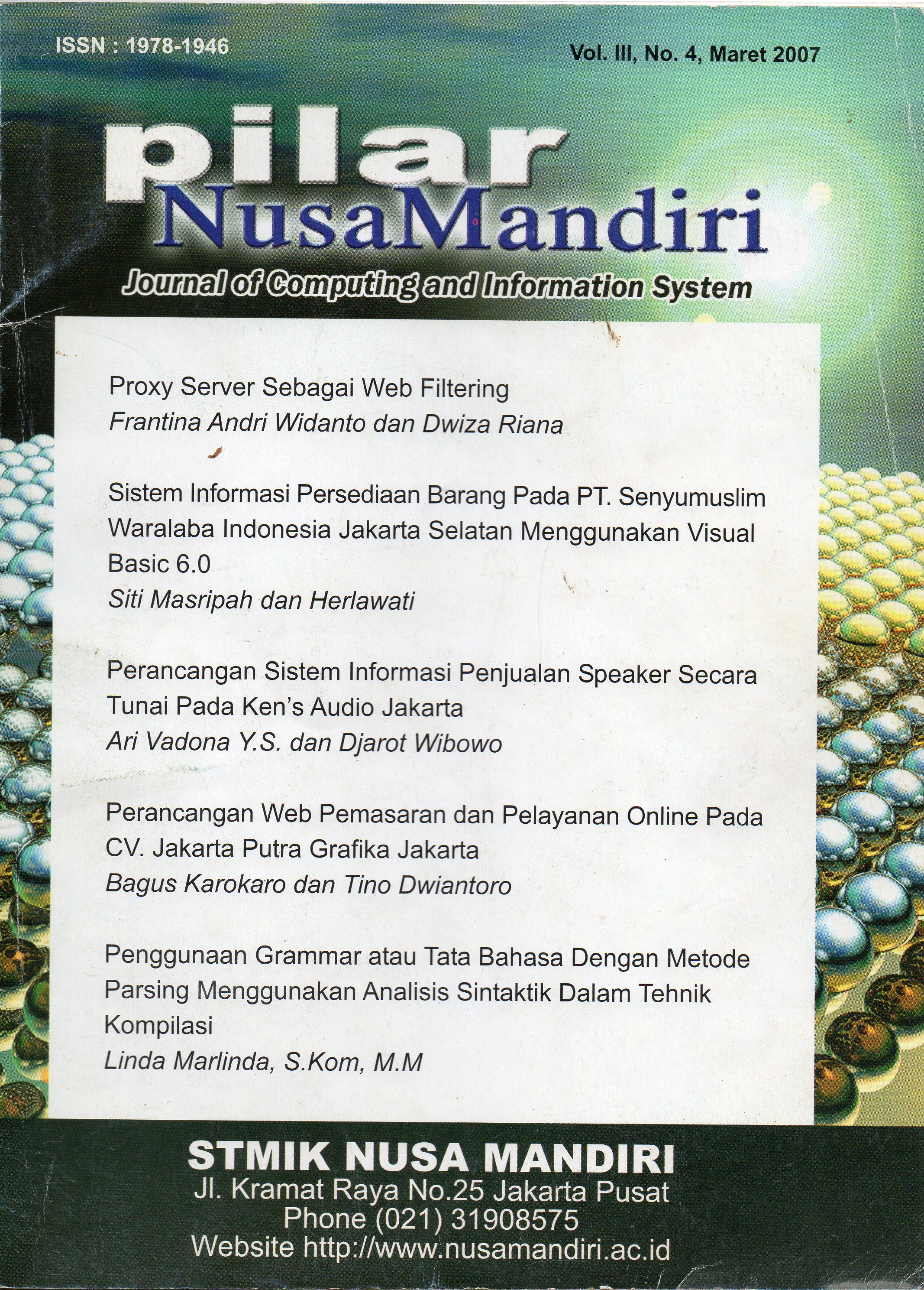 Jurnal Pilar Nusa Mandiri : Journal of Computing and Information System Nusa Mandiri : Journal of Computing and Information System is a formation of the Information Systems study program, which was originally a medium for accommodating scientific writings of STMIK Nusa Mandiri Jakarta Information Systems lecturers. merupakan jurnal ilmiah yang diterbitkan oleh program studi sistem informasi STMIK Nusa Mandiri. Jurnal ini berisi tentang karya ilmiah yang bertemakan: Aplikasi Sains, Animasi Interaktif, Sistem Pakar, Sistem Penunjang, Keputusan, Perancangan Sistem Informasi, E-Commerce