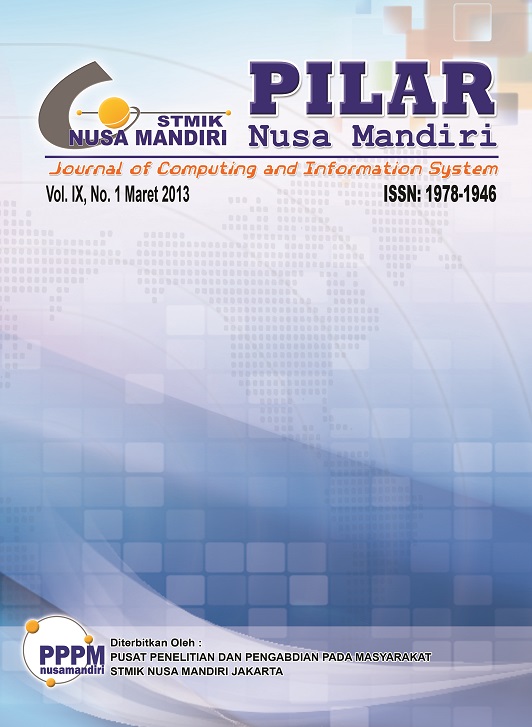 Jurnal Pilar Nusa Mandiri : Journal of Computing and Information System is a formation of the Information Systems study program, which was originally a medium for accommodating scientific writings of STMIK Nusa Mandiri Jakarta Information Systems lecturers. merupakan jurnal ilmiah yang diterbitkan oleh program studi sistem informasi STMIK Nusa Mandiri. Jurnal ini berisi tentang karya ilmiah yang bertemakan: Rekayasa Perangkat Lunak, Sistem Pakar, Sistem Penunjang, Keputusan, Perancangan Sistem Informasi, Data Mining, Pengolahan Citra