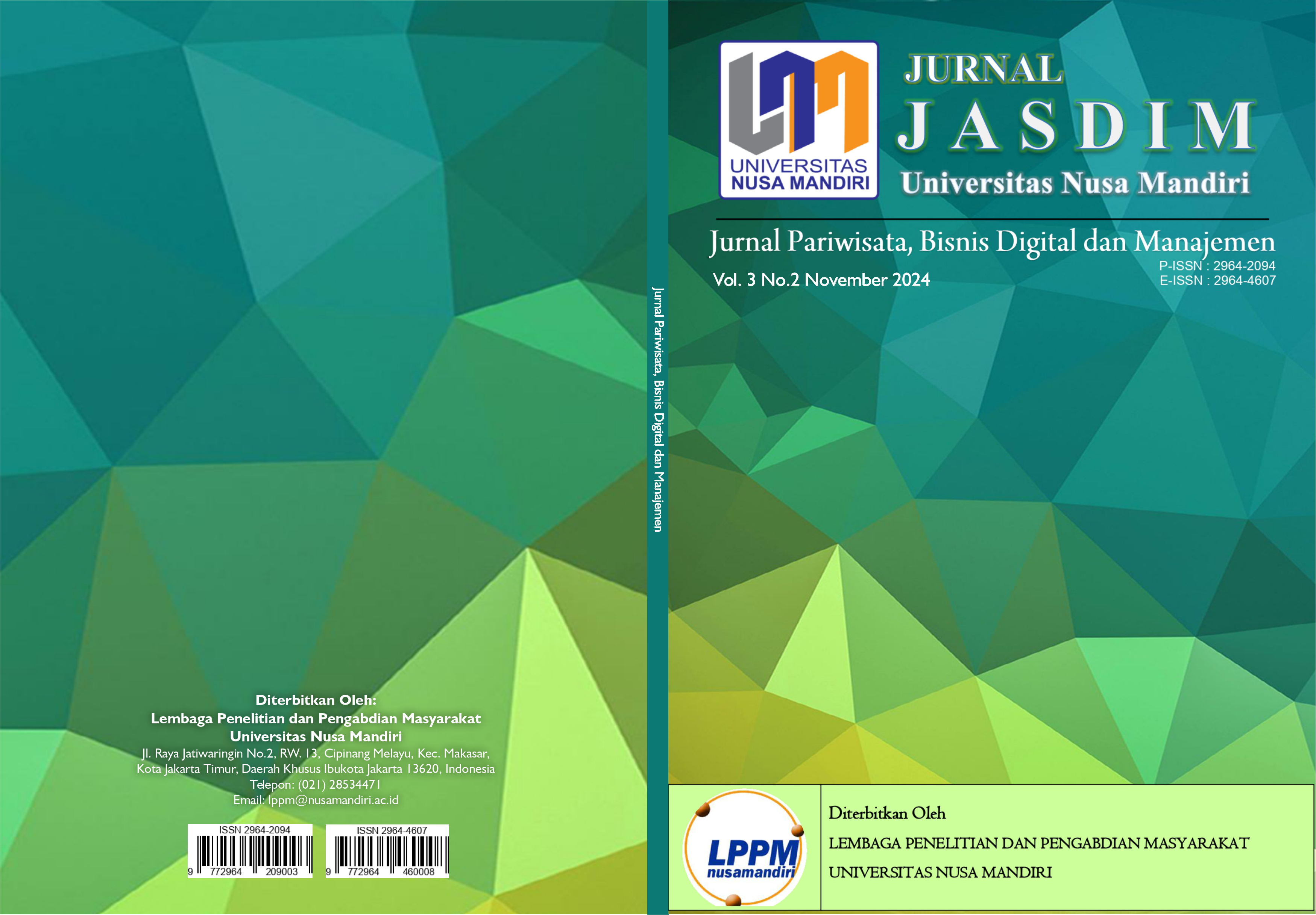 Jurnal Pariwisata, Bisnis Digital dan Manajemen Nusa Mandiri merupakan jurnal yang diperuntukan dalam bidang keilmuan ekonomi dan bisnis yang mencakup terkait pengetahuan dan wawasan pengembangan manajemen dan bisnis khususnya di Indonesia. Adapun kajian keilmuan artikel pada Jurnal Pariwisata, Bisnis Digital dan Manajemen diantaranya diperuntukan untuk bidang ilmu manajemen, bisnis digital dan pariwisata atau perhotelan. Tujuan utama pada jurnal ini yaitu sebagai wadah penyebarluasan artikel ilmiah dibidang Ekonomi dan Bisnis yang bersifat terbuka untuk mahasiswa, peneliti ataupun akademisi baik dilingkungan internal Universitas Nusa Mandiri dan juga eksternal Universitas Nusa Mandiri. Jurnal Pariwisata, Bisnis Digital dan Manajemen diterbitkan oleh Fakultas Ekonomi dan Bisnis Universitas Nusa Mandiri menggunakan dua bahasa yaitu bahasa Indonesia dan bahasa bahasa Inggris serta terbit sebanyak 2 kali dalam 1 tahun pada bulan Mei dan bulan November.